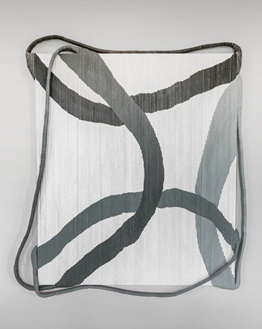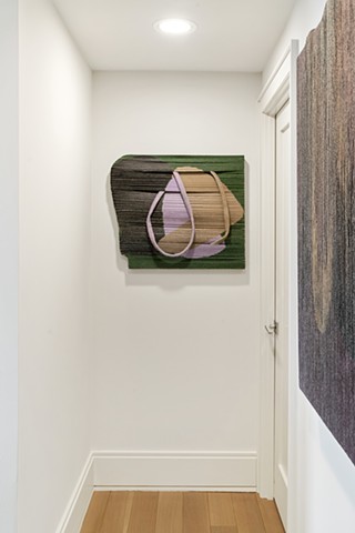 What moves, above all, is the material itself. The torn canvas strips that rebuild each painting do more than carry color — they carry history, the ghost of the original scale, the memory of what was destroyed to make this. And paradoxically, the torn edge liberates the form: extensions of canvas dangle beyond the rectangle, curl away from the wall, loop and hang, at times becoming a frame that holds the painting from the outside. The boundary between painting and object, between image and edge, between containment and escape, dissolves. Works like Escaping the Beauty Instrument and Shrinking into Definition make this dialectic explicit in their titles: the work is aware of its own confinement, and it presses against it.